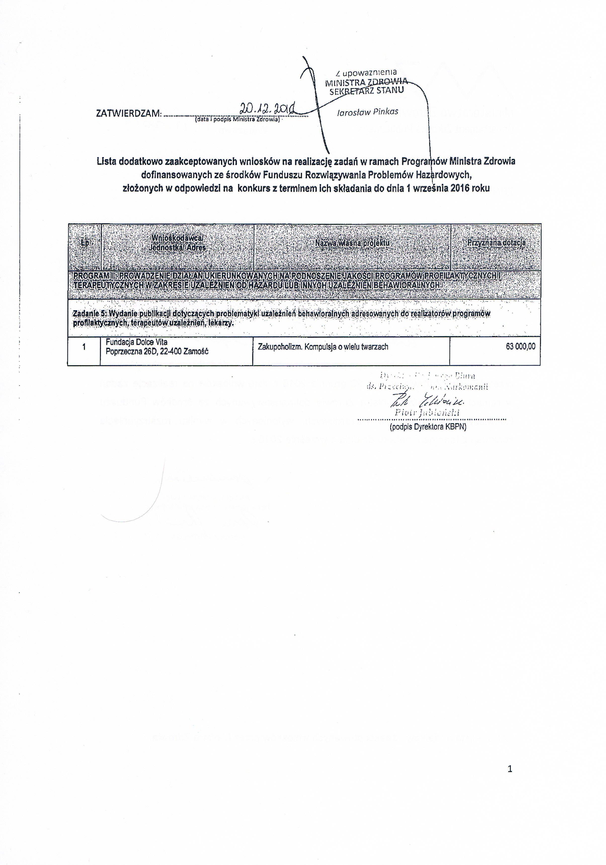 - Ogłoszenie listy wniosków, które uzyskały akceptację Ministra Zdrowia na realizację zadań w ramach programu „Wspieranie badań naukowych dotyczących zjawiska uzależnienia od hazardu lub innych uzależnień niestanowiących uzależnienia od substancji psychoaktywnych a także rozwiązywania problemów z tym związanych”
